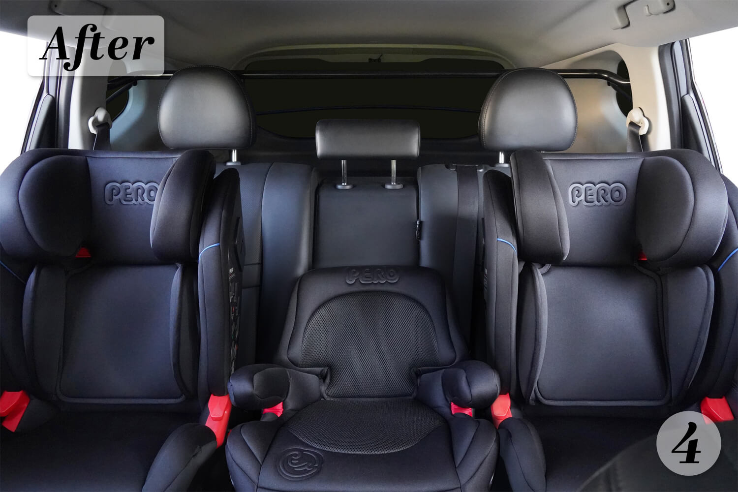 - 圖4:2台 PERO i-Size Cento安全座椅 + 1台PERO NI增高墊搭配2支WIDFIX PLUS(總延伸量17cm)
